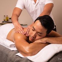 - 목, 어깨, 등 마사지는 어깨 뼈 사이에서 압박을 주며 목과 어깨 주변 근육을 마사지하여 이 지역의 통증과 긴장을 완화하는 기술입니다.